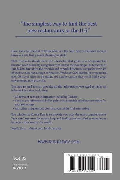 Have you ever wanted to know what are the best new restaurants in your town or a city that you are planning to visit? Well, thanks to Kunda Eats, the search for that great new restaurant has become much easier. By using their own unique methodology, the founders of Kunda Eats have done the research and compiled the most comprehensive list of the best new restaurants in America. With over 200 entries, encompassing over 50 major cities in 35 states, you can be certain that you'll find a great new restaurant in your city. The easy to read format provides all the information you need to make an informed decision, including: ¿ All relevant contact information including Twitter ¿ Simple, yet informative bullet points that provide excellent overviews for each restaurant ¿ Any other unique attributes that you might find interesting