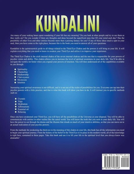 Are many of your waking hours spent wondering if your life has any meaning? Do you look at other people and try to see them as they really are? Do you wonder if there are thoughts and ideas beyond the superficial ones that fill your mind each day? Has the possibility of other lives and other entities become more than a passing fantasy for you? If any of these ideas touch a spot in your soul, then you have come to the right place, because this book is for you... Kundalini is the quintessential guide to all things related to the Third Eye Chakra and the powers it will bring to your life. It will explain everything that you need to know to awaken your Third Eye and utilize it to improve your experience... The Third Eye Chakra is the sixth internal chakra of the seven internal chakras and the one that is responsible for your powers of psychic vision and ability. This chakra allows you to increase the level of spiritual awareness in your daily life. You'll be able to navigate the world a lot better when you expand your powers of intuition... In this book you'll learn and understand all of the capabilities available to you through: Kundalini Awakening Chakra Awakening Spiritual awareness Channeling Expand mind power Mediumship Clairvoyance Mysticism Intuition And much more... Increasing your spiritual awareness isn't difficult, and it's not out of the realm of possibilities for you. Everyone can tap into their psychic powers with a little practice... This book will instruct you in specific methods such as: Crystals Mindful meditation Yoga Affirmations Essential oils Relaxing Chakra meditation And so much more! Once you've awakened your Third Eye, you'll have all the possibilities of the Universe at your disposal. You'll be able to communicate with entities in other realms like the astral world. You'll know the truth that you seek in your daily life. You'll have the power to cut through the drama and the illusion that clouds so much of your intuitive abilities, so that you can move on to an actual realization of your psychic powers... This book has all the information you need to begin your spiritual journey. From the history of the belief in the Third Eye to its place in the modern world, all of the knowledge is right here. Get this book and use it to lift your life to the spiritual level that you always knew was attainable! Start your Kundalini journey today! Grab your copy of Kundalini now!