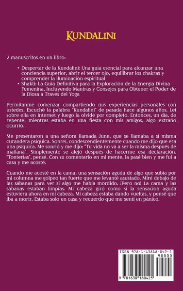 Dos manuscritos en un libro:Despertar de la Kundalini: Una guía esencial para alcanzar una conciencia superior, abrir el tercer ojo, equilibrar los chakras y comprender la iluminación espiritual Shakti: La Guía Definitiva para la Exploración de la Energía Divina Femenina, Incluyendo Mantras y Consejos para Obtener el Poder de la Diosa a Través del Yoga Algunos de los temas y preguntas cubiertos en la primera parte de este libro incluyen:¿Qué es la Kundalini shakti, y cuáles son sus orígenes? ¿Cuáles son los fundamentos de esta ciencia esotérica? ¿Cuál es el significado y la importancia del Despertar de la Kundalini? ¿Cómo se conecta la Kundalini con la meditación, el poder de los centros de energía y los chakras? ¿Cuál es la relación entre el despertar de la Kundalini, las capacidades psíquicas y el chakra del tercer ojo? ¿Cómo utilizo mantras, asanas, pranayama, mantras, mudras y kriyas para despertar la Kundalini? ¿Cuáles son los beneficios de despertar la Kundalini? ¿Son los efectos fáciles de manejar? Si no, ¿qué hay que saber antes de embarcarse en el viaje? ¿Quién puede ayudar? ¿Qué hacer después de que la Kundalini se ha despertado? Y mucho más Algunos de los temas y preguntas cubiertos en la segunda parte de este libro incluyen:Qué es Shakti o la Energía Divina Femenina La importancia de Shakti en el mundo actual Diferencias teóricas en prácticas asociadas con Shakti Prácticas sencillas relacionadas con Shakti Mantras Shakti El Tantra Shakti Yantras Shakti El Culto de Shakti en el Budismo, Hinduismo y Taoísmo El Culto de Shakti en la India y el Tíbet Kriyatmaka Shakti Las Diez Manifestaciones de la Diosa Tántrica Agama Yoginis y Dakinis Kundalini Shakti y su Despertar La Dualidad de Shakti ¡Y mucho más! ¡Obtenga este libro ahora para aprender más sobre el despertar de la Kundalini y Shakti!