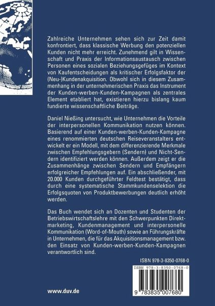 Daniel Nießing untersucht, wie Unternehmen die Vorteile der interpersonellen Kommunikation nutzen können. Basierend auf einer Kunden-werben-Kunden-Kampagne eines renommierten deutschen Reiseveranstalters entwickelt er ein Modell, mit dem differenzierende Merkmale zwischen Empfehlungsgebern (Sendern) und Nicht-Sendern identifiziert werden können. Außerdem zeigt er die Zusammenhänge zwischen Sendern und Empfängern erfolgreicher Empfehlungen auf. Ein abschließender, mit 20.000 Kunden durchgeführter Feldtest bestätigt, dass durch eine systematische Stammkundenselektion die Erfolgsquoten von Produktbewerbungen deutlich erhöht werden.