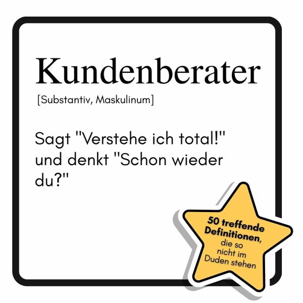 Achtung, hier wird gelacht, bis das Headset wackelt: "Kundenberater: Sagt "Verstehe ich total!" und denkt "Schon wieder du?"" entlarvt die skurrile Welt der Service-Hotlines - mit 50 pointierten Definitionen und Illustrationen, die zeigen, was wirklich hinter dem Lächeln am Telefon steckt. Wer wissen will, was sich hinter Begriffen wie "Warteschleife", "Kulanzgutschein" oder "Chatbot-Kollege" verbirgt, findet hier die schonungslose Wahrheit - und jede Menge Grund zum Schmunzeln.Für wen dieses Buch optimal geeignet ist:- Für alle, die im Kundenservice arbeiten (oder überleben)- Für Freunde von Bürohumor und Alltagsironie- Für alle, die schon mal in einer Warteschleife festhingenEin Geschenk für Kolleginnen, ein Trostpflaster für gestresste Servicekräfte und ein Spiegelbild des täglichen Callcenter-Wahnsinns.Was beim Kauf dieses Buches erwartet werden kann:- 50 witzige Definitionen aus dem Alltag von Kundenberatern- Passende Illustrationen zu jedem Begriff- Humorvolle Einblicke in die Servicewelt- Perfekt als Geschenk oder Pausenlektüre
