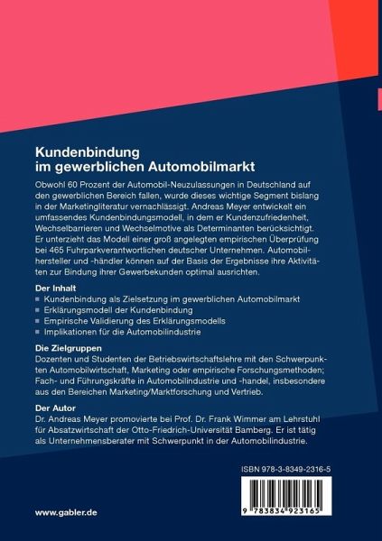 Obwohl 60 Prozent der Automobil-Neuzulassungen in Deutschland auf den gewerblichen Bereich fallen, wurde dieses wichtige Segment bislang in der Marketingliteratur vernachlässigt. Andreas Meyer entwickelt ein umfassendes Kundenbindungsmodell, in dem er Kundenzufriedenheit, Wechselbarrieren und Wechselmotive als Determinanten berücksichtigt. Er unterzieht das Modell einer groß angelegten empirischen Überprüfung bei 465 Fuhrparkverantwortlichen deutscher Unternehmen. Automobilhersteller und -händler können auf der Basis der Ergebnisse ihre Aktivitäten zur Bindung ihrer Gewerbekunden optimal ausrichten.