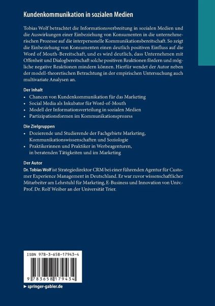 Tobias Wolf betrachtet die Informationsverbreitung in sozialen Medien und die Auswirkungen einer Einbeziehung von Konsumenten in die unternehmerischen Prozesse auf die interpersonelle Kommunikationsbereitschaft. So zeigt die Einbeziehung von Konsumenten einen deutlich positiven Einfluss auf die Word of Mouth-Bereitschaft, und es wird deutlich, dass Unternehmen mit Offenheit und Dialogbereitschaft solche positiven Reaktionen fördern und mögliche negative Reaktionen mindern können. Hierfür wendet der Autor neben der modell-theoretischen Betrachtung in der empirischen Untersuchung auch multivariate Analysen an.