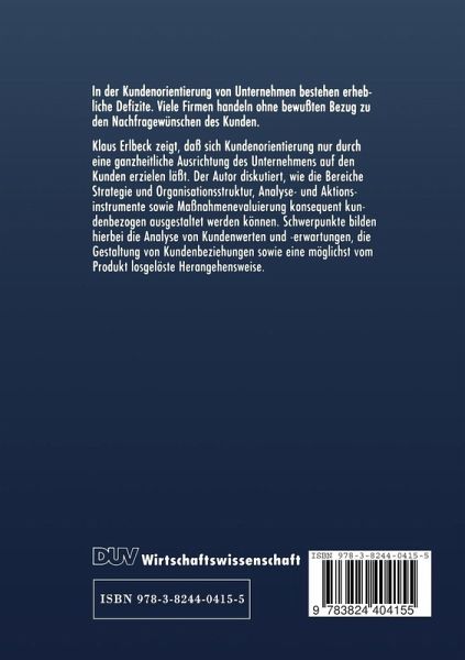In der Kundenorientierung von Unternehmen bestehen erhebliche Defizite. Viele Firmen handeln ohne bewußten Bezug zu den Nachfragewünschen des Kunden. Klaus Erlbeck zeigt, daß sich Kundenorientierung nur durch eine ganzheitliche Ausrichtung des Unternehmens auf den Kunden erzielen läßt. Der Autor diskutiert, wie die Bereiche Strategie und Organisationsstruktur, Analyse- und Aktionsinstrumente sowie Maßnahmenevaluierung konsequent kundenbezogen ausgestaltet werden können. Schwerpunkte bilden hierbei die Analyse von Kundenwerten und -erwartungen, die Gestaltung von Kundenbeziehungen sowie eine möglichst vom Produkt losgelöste Herangehensweise.