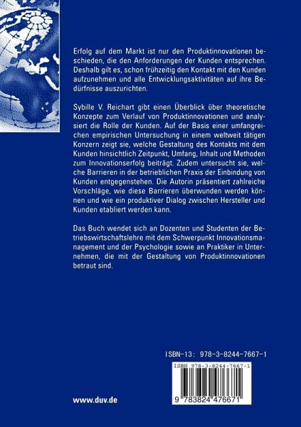 Sybille V. Reichart gibt einen Überblick über theoretische Konzepte zum Verlauf von Produktinnovationen und analysiert die Rolle der Kunden. Auf der Basis einer umfangreichen empirischen Untersuchung in einem weltweit tätigen Konzern zeigt sie, welche Gestaltung des Kontakts mit dem Kunden hinsichtlich Zeitpunkt, Umfang, Inhalt und Methoden zum Innovationserfolg beiträgt. Zudem untersucht sie, welche Barrieren in der betrieblichen Praxis der Einbindung von Kunden entgegenstehen. Die Autorin präsentiert zahlreiche Vorschläge, wie diese Barrieren überwunden werden können und wie ein produktiver Dialog zwischen Hersteller und Kunden etabliert werden kann.