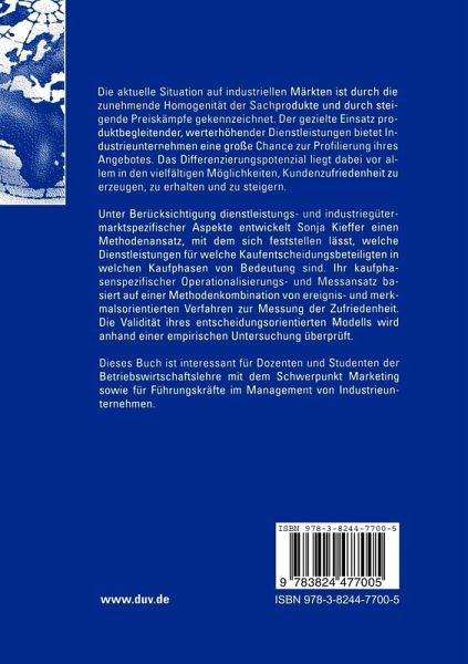 Unter Berücksichtigung dienstleistungs- und industriegütermarktspezifischer Aspekte entwickelt Sonja Kieffer einen Methodenansatz, mit dem sich feststellen lässt, welche Dienstleistungen für welche Kaufentscheidungsbeteiligten in welchen Kaufphasen von Bedeutung sind. Ihr kaufphasenspezifischer Operationalisierungs- und Messansatz basiert auf einer Methodenkombination von ereignis- und merkmalsorientierten Verfahren zur Messung der Zufriedenheit. Die Validität ihres entscheidungsorientierten Modells wird anhand einer empirischen Untersuchung überprüft.