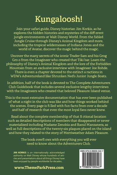 Kungaloosh! Join your safari guide, Disney historian Jim Korkis, as he explores the hidden histories and mysteries of the different jungle environments at Walt Disney World. From the fabled Jungle Cruise through Disney's Animal Kingdom and more, including the tropical wildernesses of Indiana Jones and the world of Avatar, discover the magic behind the magic. Uncover the many secrets of the iconic Trader Sam and his Grog Grotto from the Imagineer who created that Tiki bar. Learn the philosophy of Disney's Animal Kingdom and the lore of the Forbidden Mountain from an exclusive interview with Imagineer Joe Rohde. There is even a chapter devoted to the extinct attractions in WDW's Adventureland like Shrunken Ned's Junior Jungle Boats. In addition, half of the book is devoted to The Complete Adventurers Club Guidebook that includes several exclusive lengthy interviews with the Imagineers who created that beloved Pleasure Island venue. This is the most extensive documentation that has ever been published of what a night in the club was like and how things worked behind the scenes. Every page is filled with fun facts from over a decade and half of research that even the most loyal fans never knew. Read about the complete membership of that fictional location such as detailed descriptions of members that disappeared or never materialized including Madame Zenobia and Raoul Manzanera, as well as full descriptions of the twenty-six plaques placed on the island and how they related to the story of Merriweather Adam Pleasure. The book overflows with everything you will ever need to know about the Adventurers Club.