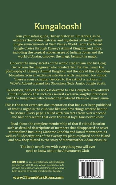 Kungaloosh! Join your safari guide, Disney historian Jim Korkis, as he explores the hidden histories and mysteries of the different jungle environments at Walt Disney World. From the fabled Jungle Cruise through Disney's Animal Kingdom and more, including the tropical wildernesses of Indiana Jones and the world of Avatar, discover the magic behind the magic. Uncover the many secrets of the iconic Trader Sam and his Grog Grotto from the Imagineer who created that Tiki bar. Learn the philosophy of Disney's Animal Kingdom and the lore of the Forbidden Mountain from an exclusive interview with Imagineer Joe Rohde. There is even a chapter devoted to the extinct attractions in WDW's Adventureland like Shrunken Ned's Junior Jungle Boats. In addition, half of the book is devoted to The Complete Adventurers Club Guidebook that includes several exclusive lengthy interviews with the Imagineers who created that beloved Pleasure Island venue. This is the most extensive documentation that has ever been published of what a night in the club was like and how things worked behind the scenes. Every page is filled with fun facts from over a decade and half of research that even the most loyal fans never knew. Read about the complete membership of that fictional location such as detailed descriptions of members that disappeared or never materialized including Madame Zenobia and Raoul Manzanera, as well as full descriptions of the twenty-six plaques placed on the island and how they related to the story of Merriweather Adam Pleasure. The book overflows with everything you will ever need to know about the Adventurers Club.