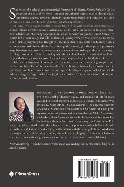 Set within the cultural and geographical framework of Nigeria, Kunim: Raise Me Up is a collection of not-so-short stories that examine universal themes, such as discrimination and familial discord, as well as culturally specific biases, beliefs, and traditions, as it takes its readers on three very distinct but equally enlightening journeys. In "Fate," two young, motherless sisters are forced to navigate the often-tumultuous waters of intra-cultural stereotyping and discrimination while their father is away on business. "Shadows" tells the story of a young Nigerian businessman, currently living in the United States, who returns to his home village and falls for a beautiful young woman whose mysterious nature has him rethinking everything he'd thought he understood about himself, the world, and the nature of the supernatural. And finally, in "Eyes that Speak," a young girl whose parents perpetually keep themselves too busy to even notice her, let alone the unravelling of their own marriage, is feeling disconnected, alone, and fed up with the world until an unexpected kindness from a supposed adversary changes absolutely everything (though perhaps not for the better). Whether the Nigerian culture is your own, familiar to your own, or nothing like your own, the heart of this collection is the universality of the themes, shining a light into the depth of mankind's complicated nature and how we cope with living as disparate collections of individuals among the larger multitudes, juggling cultural traditions, expectations, and our own instinctive need to belong.