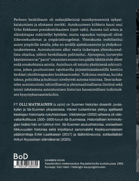 Perheen henkilöauto oli sodanjälkeisinä vuosikymmeninä nykyaikaistumisen ja elintason merkki. Autokuumeen kiihkein kausi osui Urho Kekkosen presidenttikauteen (1956¿1981). Autosta tuli arkea ja elämäntapaa määritellyt hyödyke, mutta vapauden varjopuoli olivat liikennekuolemat ja ympäristöongelmat. Yhteiskunta mobilisoitui auton ympärille tavalla, joka on syvällä ajattelussamme ja yhdyskuntarakenteessa. Autoistuminen alkoi vaatia tiukempaa yhteiskunnallista ohjailua, jolloin henkilöauto politisoitui. Ajonopeus, turvavyön käyttäminen tai ¿parin¿ ottaminen ennen tien päälle lähtöä eivät olleet enää omakohtaisia asioita. Autoiluun oli totuttu yksityisenä arkirutiinina, johon puuttuminen rajoittavilla järjestelmäsäännöillä koettiin herkästi yksilönvapauden loukkaamiseksi. Tutkimus osoittaa, kuinka talous, politiikka ja kulttuuri niveltyivät autossa toisiinsa. Teos tarkastelee autoistumista inhimillisenä ja yleismaailmallisena ilmiönä sekä toimii johdantona autoistumisen historian uusimman kansainvälisen tutkimuksen kysymyksenasetteluihin.