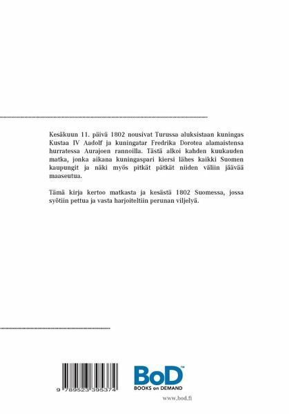 Kesäkuun 11. päivä 1802 nousivat Turussa aluksistaan kuningas Kustaa IV Aadolf ja kuningatar Fredrika Dorotea alamaistensa hurratessa Aurajoen rannoilla. Tästä alkoi kahden kuukauden matka, jonka aikana kuningaspari kiersi lähes kaikki Suomen kaupungit ja näki myös pitkät pätkät niiden väliin jäävää maaseutua. Tämä kirja kertoo matkasta ja kesästä 1802 Suomessa, jossa syötiin pettua ja vasta harjoiteltiin perunan viljelyä.