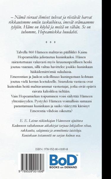 E.E. Leivon viikinkiajan Hämeeseen sijoittuva historiallinen jatkokertomus Kadonneen valtakunnan aikakirjat tarjoaa lukijalleen vihaa, rakkautta, salajuonia ja armottomia taisteluja. Kuninkaan testamentti on sarjan kolmas osa, jota ennen ovat ilmestyneet romaanit Soturiprinsessa ja Idän turkiskauppias.
