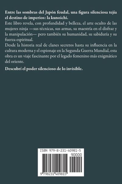 Entre las sombras del Japón feudal, una figura silenciosa tejía el destino de imperios: la kunoichi. Este libro revela, con profundidad y belleza, el arte oculto de las mujeres ninja -sus técnicas, sus armas, su maestría en el disfraz y la manipulación- pero también su humanidad, su sabiduría y su fuerza espiritual. Desde la historia real de clanes secretos hasta su influencia en la cultura moderna y el espionaje en la Segunda Guerra Mundial, esta obra es un viaje fascinante por el legado femenino más enigmático del oriente. Descubrí el poder silencioso de lo invisible.