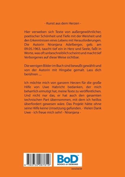 Hier verweben sich Texte von außergewöhnlicher, poetischer Schönheit und Tiefe mit der Weisheit und den Erkenntnissen eines Lebens mit Herausforderungen. Die Autorin Niranjana Adelberger, geb. am 09.05.1963, taucht tief ein in Herz und Seele, faßt in Worte, was oft unbeschreiblich scheint und macht tief Verborgenes auf diese Weise sichtbar. Die wenigen Bilder im Buch sind bewußt gewählt und von der Autorin mit Hingabe gemalt. Lassen Sie sich berühren ....Ich möchte mich von ganzem Herzen für die große Hilfe von Uwe Habricht bedanken, der mich beharrlich ermutigt hat, meine Texte zu veröffentlichen. Und nicht nur das, er hat auch den gesamten technischen Part übernommen, mit dem ich heillos überfordert gewesen wäre. Das Projekt hätte ohne seine Hilfe keine Umsetzung gefunden. - Vielen Dank Uwe - ich freue mich sehr! - Niranjana -