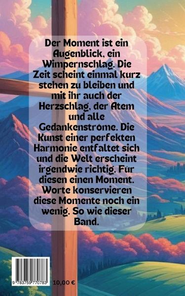 Der Moment ist ein Augenblick, ein Wimpernschlag. Die Zeit scheint einmal kurz stehen zu bleiben und mit ihr auch der Herzschlag, der Atem und alle Gedankenströme. Die Kunst einer perfekten Harmonie entfaltet sich und die Welt erscheint irgendwie richtig. Für diesen einen Moment. Worte konservieren diese Momente noch ein wenig. So wie dieser Band.
