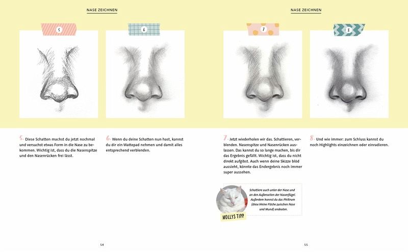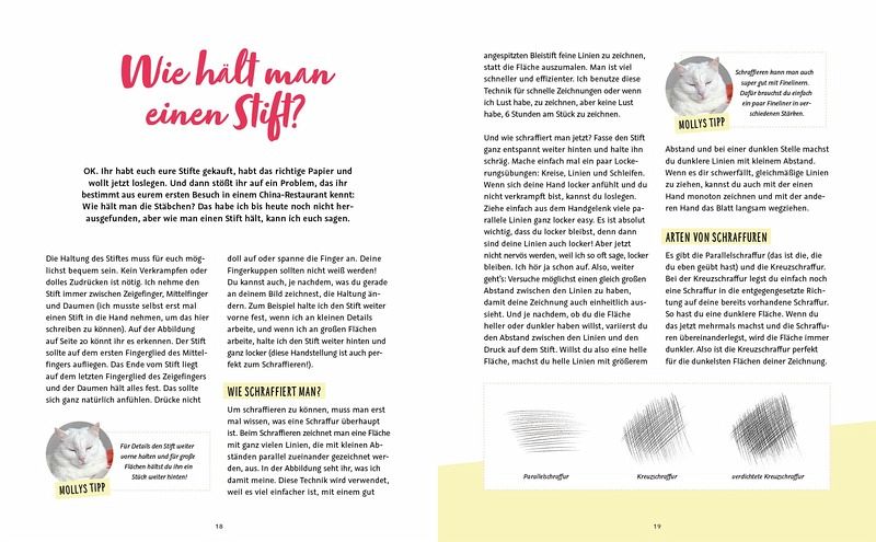Für Anfänger, die zeichnen lernen wollen, gibt es einen ausführlichen Grundlagenteil. Darin erläutert die Künstlerin, worauf es bei der Auswahl von Bleistiften, Finelinern und sonstigen Stiften ankommt. Die Star-Künstlerin arbeitet hauptsächlich mit Bunt- und Bleistiften sowie Finelinern, die ihren einzigartigen Stil ausmachen. Um ihre Trendmotive selbst für Anfänger nachzeichenbar zu machen, werden alle Motive Schritt für Schritt erklärt. Zudem liefert das Zeichenbuch auch für fortgeschrittene Zeichner wertvolle Übungen zur Technik, von der richtigen Perspektive über die Verwendung von Schatten bis hin zur Darstellung von Augen und Lippen.