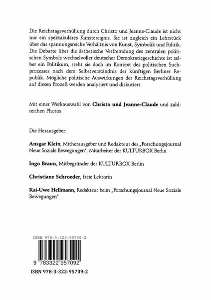 Zur Ästhetik der repräsentativen Demokratie Die Reichstagsverhüllung und das Selbstverständnis der künftigen Berliner Republik.- I. Kunst, Symbolik und Politik.- Die Debatte über Kunst und politische Symbolik Politische Denkanstöße anläßlich der Reichstagsverhüllung.- Der Reichstag und die Kunst Politik - Symbole - Kunst.- Nationale Symbole erfordern behutsamen Respekt Rede während der 211. Sitzung des Deutschen Bundestages.- Und dann die Enthüllung Anmerkungen zum Projekt von Christo und Jeanne-Claude.- Die Kunst, in Deutschland Kunst zu machen.- Zur Verpackung des Reichstages.- Die Reichstagsverhüllung: Eine mißglückte Allegorie?.- Ein Atemzug: Denk mal!.- Die Reichstagsverhüllung: Ein würdiges Zeichen.- Die Hauptstadt: Ein Spiegelbild der Nation.- Die Diskussion fiber die Reichstagsverhüllung Hintergründe, Analysen, Kommentare.- Eine Chronik des Projekts "Wrapped Reichstag".- Wir stimmen hier nicht über Kunst ab! Die Debatte über die Reichstagsverhüllung im Deutschen Bundestag.- Zwischen Pathos und Polemik Die Reichstagsverhüllung im politischen Diskurs.- Parlamentssymbolik Christos Tücher und die deutsche Demokratie.- Fußnote in der Geschichte des Belanglosen.- Betrachtungen von außen Soziologische und philosophische Reflexionen.- Wrapped Reichstag: An der Schwelle zur neuen Zeitordnung Anmerkungen zur politischen Aktualität des Ästhetischen.- Die Reichstagsverhüllung: Ein Spill-over-Ereignis?.- II. Kunst und Kultur - Bezüge und Kontexte des Werkes von Christo und Jeanne-Claude.- Kultur, Kunst, Theater.- Eine Laudatio Das Werk von Christo und Jeanne-Claude als Beitrag zur Zusammenführung von Kunst und Wissenschaft.- Kopf-Theater Von der Sentimentalität des unschuldigen Blicks.- Der architektonische Kontext derReichstagsverhüllung.- Impulse für die Architektur von Parlament und Regierung in Berlin.- Zur Architektur der Metropole und Bundeshauptstadt Berlin.- III. Vom Reichstag zum Bundestag Historische Tiefenschichten eines politischen Symbols.- Der Reichstag in der Geschichte des deutschen Parlamentarismus.- Vom Deutschen Reich bis zur Weimarer Republik Entwicklungslinien der parlamentarischen Demokratie in Deutschland 1867-1933.- Der Reichstag im Spiegel der deutschen Geschichte.- Der Reichstag in der NS-Zeit.- In den Fesseln von Status und Kompromißlösungen Der Reichstag zwischen Wiederaufbau und Verhüllung.- Zur Geschichte des Reichstagsbebäudes.- Das Reichstagsgebäude Ein baugeschichtlicher Überblick.- IV. Politische Kultur und repräsentative Demokratie Politikwissenschaftliche Zugänge.- Politische Symbolik und kollektive Identität.- Sichtbare Macht Das Reichstagsgebäude als politisches Symbol.- Der Reichstag: Ein Zeichen wofür? Zeichentheoretische Betrachtungen über ein deutsches Symbol.- Der Reichstag als politisches Kollektivsymbol Anmerkungen zum deutschen Nationalmythos.- Politische Symbolik und postnationale Identität.- Zum Selbstverständnis der zweiten deutschen Nachkriegsrepublik.- Symbolische Dimensionen politischer Repräsentation.- Die Reichstagsverhüllung: Staatsrepräsentation und Repräsentation von Gegenmacht.- Repräsentativästhetik und politische Kultur.- Aufklärung und Verschleierung Anmerkungen zur Symbolischen Politik.- Symbolische Politik und praktische Urteilskraft.- Symbolische Politik und praktische Urteilskraft.- Die Darstellungsform der Erinnerung Über die Schwierigkeit, "aus Geschichte zu lernen".- Ästhetizismus als Entethisierung der Politik.- Setzt die Demokratie auf Symbol und Ritual oder auf politische Bildung?.-Die Herausgeber und Autoren.- Bildnachweise.