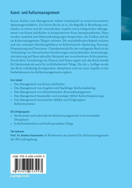 Kunst, Kultur und Management stehen traditionell in einem besonderen Spannungsverhältnis. Ziel dieses Buchs ist es, die Begriffe in Beziehung zueinander zu setzen und die wesentlichen Aspekte eines erfolgreichen Managements von Kunst und Kultur in komprimierter Form herauszuarbeiten. Dazu werden zunächst jene Rahmenbedingungen besprochen, die Einfluss auf die im Kulturmanagement Tätigen nehmen. Die anschließenden Kapitel widmen sich den zentralen Handlungsfeldern im Kulturbetrieb: Marketing, Personal, Finanzierung und Tourismus. Charakteristisch für das vorliegende Buch ist die Verbindung von theoretischen Fundierungen und praktischer Anwendungsorientierung auf Basis aktueller Beispiele aus verschiedenen Kultursparten. Durch diese Verzahnung von Theorie und Praxis eignet sich das Buch sowohl für Studierende als auch für im Kulturbetrieb Tätige. Für die 3. Auflage wurde das Buch vollständig durchgesehen, aktualisiert und um neue Aspekte in der Fachdiskussion des Kulturmanagements ergänzt.