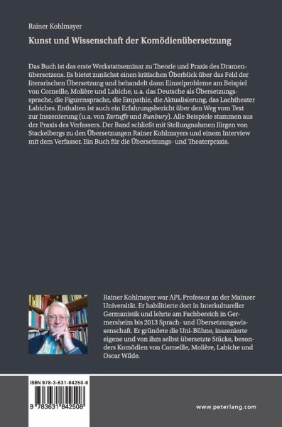 Das Buch ist das erste Werkstattseminar zu Theorie und Praxis des Dramenübersetzens. Es bietet zunächst einen kritischen Überblick über das Feld der literarischen Übersetzung und behandelt dann Einzelprobleme am Beispiel von Corneille, Molière und Labiche, u.a. das Deutsche als Übersetzungssprache, die Figurensprache, die Empathie, die Aktualisierung, das Lachtheater Labiches. Enthalten ist auch ein Erfahrungsbericht über den Weg vom Text zur Inszenierung (u.a. von Tartuffe und Bunbury). Alle Beispiele stammen aus der Praxis des Verfassers. Der Band schließt mit Stellungnahmen Jürgen von Stackelbergs zu den Übersetzungen Rainer Kohlmayers und einem Interview mit dem Verfasser. Ein Buch für die Übersetzungs- und Theaterpraxis.