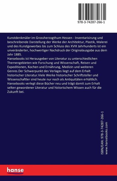 Kunstdenkmäler im Grossherzogthum Hessen - Inventarisirung und beschreibende Darstellung der Werke der Architektur, Plastik, Malerei und des Kunstgewerbes bis zum Schluss des XVIII Jahrhunderts ist ein unveränderter, hochwertiger Nachdruck der Originalausgabe aus dem Jahr 1885. Hansebooks ist Herausgeber von Literatur zu unterschiedlichen Themengebieten wie Forschung und Wissenschaft, Reisen und Expeditionen, Kochen und Ernährung, Medizin und weiteren Genres.Der Schwerpunkt des Verlages liegt auf dem Erhalt historischer Literatur.Viele Werke historischer Schriftsteller und Wissenschaftler sind…mehr