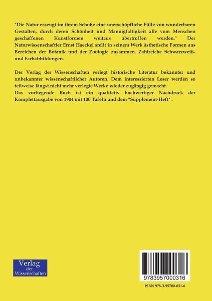 "Die Natur erzeugt im ihrem Schoße eine unerschöpfliche Fülle von wunderbaren Gestalten, durch deren Schönheit und Mannigfaltigkeit alle vom Menschen geschaffenen Kunstformen weitaus übertroffen werden." Der Naturwissenschaftler Ernst Haeckel stellt in seinem Werk ästhetische Formen aus Bereichen der Botanik und der Zoologie zusammen. Zahlreiche Schwarzweiß- und Farbabbildungen.