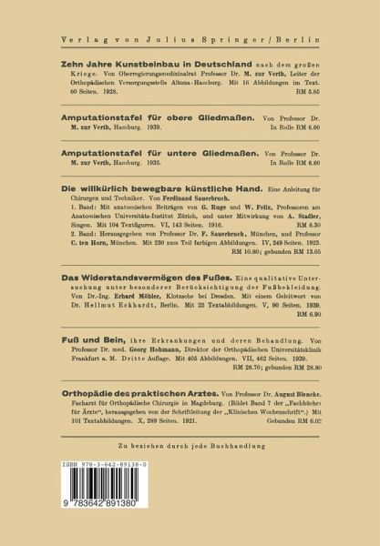 A. Allgemeines..- 1. Statistik.- 2. Gesetzliche Bestimmungen über die Gewährung orthopädischer Hilfsmittel.- 3. Werkstoffe.- 4. Die orthopädische Werkstatt.- 5. Physiologische Mechanik.- 6. Der kunstgliedgerechte Stumpf.- 7. Das stumpfgerechte Kunstglied. Anforderungen an das Kunstglied. Gesamtwert des Kunstgliedes.- 8. Kunstglieder und orthopädische Hilfsmittel in den Tropen.- 9. Bestellung, Lieferung, Abnahme, Instandhaltung und Pflege.- 10. Grundlagen der Preisgestaltung. Von O.-Reg.-Med.-Rat Dr. O. Engelke, Berlin.- B. Kunstbein..- I. Grundlagen des Kunstbeinbaues.- II. Kunstbeinversorgung.- III. Die einzelnen Ersatzglieder am Bein.- C. Künstliche Arme..- 26. Grundlagen des Kunstarmbaues.- 27. Der Arbeitsarm.- 28. Der Schmuckarm.- D. Orthopädische Hilfsmittel..- I. Allgemeine Grundlagen für den Bau orthopädischer Hilfsmittel.- II. Spezielle orthopädische Hilfsmittel.- E. Orthopädische Schuhe..- 36. Gesetzliche Grundlagen.- 37. Geschichtliches.- 38. Bestandteile und Merkmale.- 39. Die Schuhtypen.- 40. Pflege und Instandsetzung.- F. Krankenfahrzeuge..- Namen- und Sachverzeichnis.