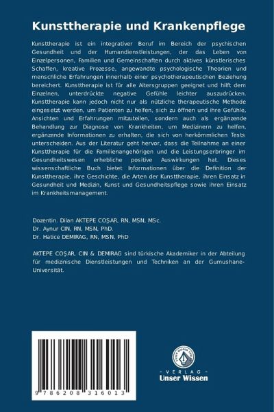 Kunsttherapie ist ein integrativer Beruf im Bereich der psychischen Gesundheit und der Humandienstleistungen, der das Leben von Einzelpersonen, Familien und Gemeinschaften durch aktives künstlerisches Schaffen, kreative Prozesse, angewandte psychologische Theorien und menschliche Erfahrungen innerhalb einer psychotherapeutischen Beziehung bereichert. Kunsttherapie ist für alle Altersgruppen geeignet und hilft dem Einzelnen, unterdrückte negative Gefühle leichter auszudrücken. Kunsttherapie kann jedoch nicht nur als nützliche therapeutische Methode eingesetzt werden, um Patienten zu helfen, sich zu öffnen und ihre Gefühle, Ansichten und Erfahrungen mitzuteilen, sondern auch als ergänzende Behandlung zur Diagnose von Krankheiten, um Medizinern zu helfen, ergänzende Informationen zu erhalten, die sich von herkömmlichen Tests unterscheiden. Aus der Literatur geht hervor, dass die Teilnahme an einer Kunsttherapie für die Familienangehörigen und die Leistungserbringer im Gesundheitswesen erhebliche positive Auswirkungen hat. Dieses wissenschaftliche Buch bietet Informationen über die Definition der Kunsttherapie, ihre Geschichte, die Arten der Kunsttherapie, ihren Einsatz in Gesundheit und Medizin, Kunst und Gesundheitspflege sowie ihren Einsatz im Krankheitsmanagement.