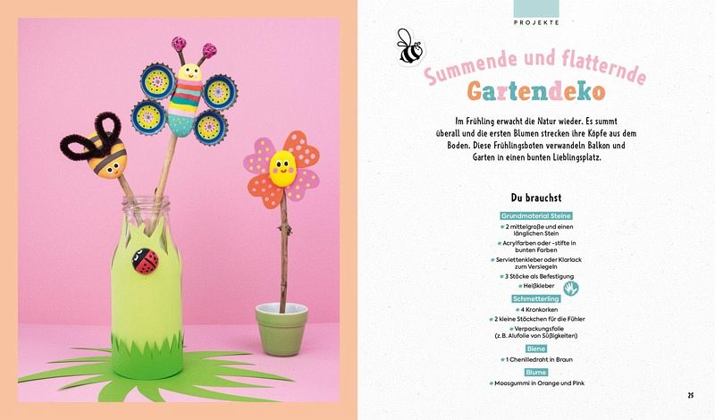 Dieses kunterbunte Bastelbuch bietet 16 innovative Bastelprojekte aus Steinen.