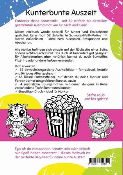 Kunterbunte Auszeit ist ein hochwertiges Ausmalbuch mit 52 gestalteten Schwarz-Weiß-Motiven für Kinder, Jugendliche und Erwachsene. Es bietet einen kreativen Rückzugsort für alle, die sich eine achtsame Pause vom Alltag gönnen möchten.Im Fokus stehen Entspannung, Stressreduktion und kreative Entfaltung - unabhängig von Alter oder Vorerfahrung. Die Motive reichen von einfachen bis hin zu detailreicheren Illustrationen und sind so gestaltet, dass sie sowohl Einsteiger als auch erfahrene Ausmalfans ansprechen.Alle Seiten sind einseitig bedruckt und optimal für Alkoholmarker, Buntstifte oder…mehr