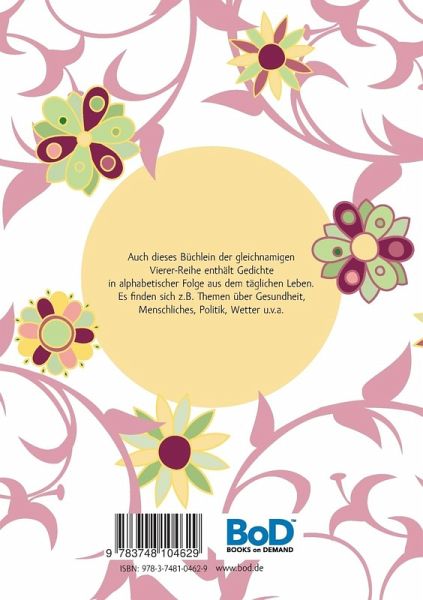 Auch dieses Büchlein der gleichnamigen Vierer-Reihe enthält Gedichte in alphabetischer Folge aus dem täglichen Leben.Es finden sich z.B. Themen über Gesundheit, Menschliches, Politik, Wetter u.v.a.
