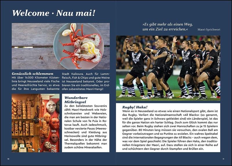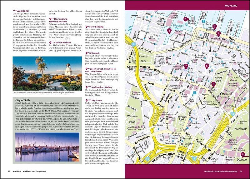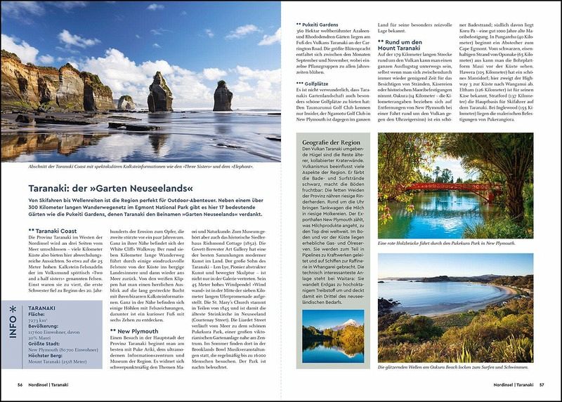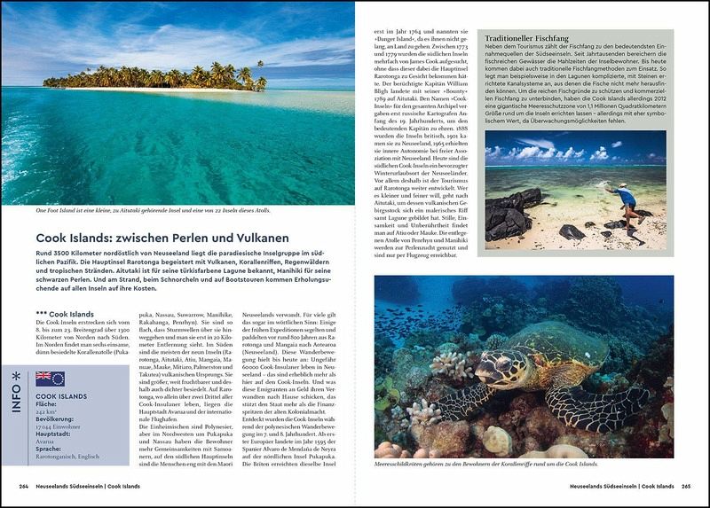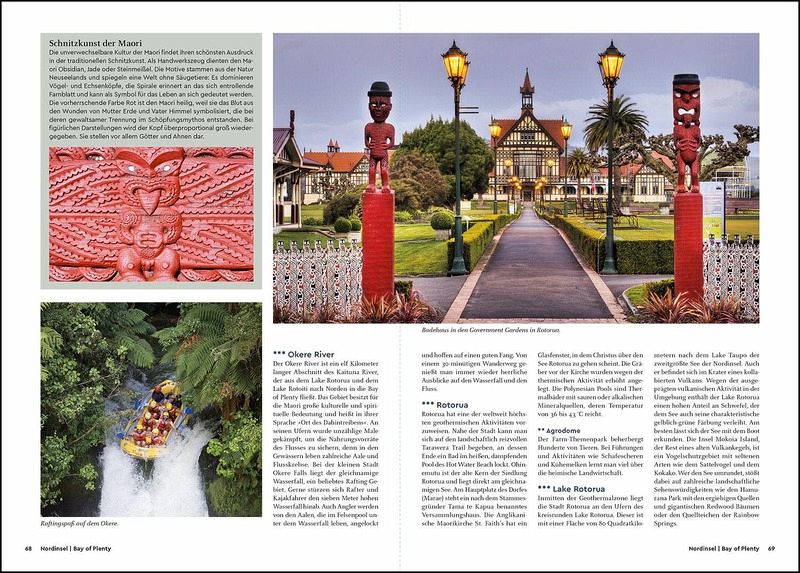 Themenkästen und -seiten tauchen in Geschichte und Traditionen ein, stellen Flora und Fauna vor und erzählen von den indigenen Maori und ihrer Kultur. Routenvorschläge, Stadtkarten und der Reiseatlas helfen bei der individuellen Vorbereitung auf eine Reise nach Neuseeland.