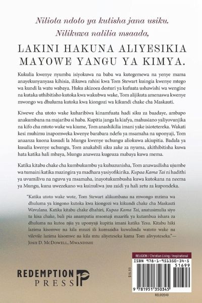 Kukulia kwenye nyumba isiyokuwa na baba wa kutegemewa na yenye mama anayekunyanyasa kihisia, ilikuwa rahisi kwa Tom Stewart kuingia kwenye mtego wa kundi la watu wabaya. Huku akizoea desturi ya kufuata ushawishi wa wengine na kutaka uthibitisho kutoka kwa wakubwa wake, Tom alijikuta amenaswa kwenye mwongo wa dhuluma kutoka kwa kiongozi wa kikundi chake cha Maskauti. Kiwewe cha utoto wake kuharibiwa kinamfuata hadi siku za baadaye, ambapo anakumbana na majaribu si haba. Kupitia janga la kiafya, mahusiano yaliyovunjika na kifo cha mtoto wake wa kiume, Tom anashikilia imani yake isiotetereka. Wakati kesi muhimu inapomweka kwenye barabara ndefu ya msamaha na uponyaji, Tom anaanza kuona kusudi la Mungu kwenye uchungu aliokuwa akiupitia. Badala ya kusalia kwenye uchungu, Tom anakabili siku zake za nyuma, akithibitisha kuwa hata katika hali mbaya, Mungu anaweza kugeuza mabaya kuwa mema. Katika kitabu chake cha kumbukumbu ya kuhuzunisha, Tom anawasilisha ujumbe wa tumaini katika mazingira ya madhara yasiyofikirika. Kupaa Kama Tai ni hadithi ya uvumilivu na nguvu ya msamaha, inayotukumbusha kuwa kutokana na neema ya Mungu, kuna uwezekano wa kuinuliwa juu zaidi ya hali zetu za kupondeka. "Katika utoto wake wote, Tom Stewart alikumbana na mwongo mzima wa dhuluma ya kingono kutoka kwa kiongozi wa kikundi chake cha Maskauti Wavulana. Katika kitabu chake dhahiri, Kupaa Kama Tai, anatusimulia siyo tu kisa chake, bali pia anampatia msomaji maarifa ya kutambua ishara za dhuluma na kutoa njia ya uponyaji kupitia imani katika Yesu. Kitabu hiki lazima kisomwe na kila mzazi ili kumsaidia kuwalinda watoto wake na vilevile lazima kisomwe na kila mtu aliyeteseka kama Tom alivyoteseka."- Josh D. McDowell, Mwandishi
