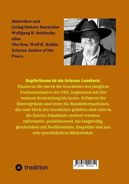 Dipl.Rpfl.(FH) Wolfgang H. Reblinsky, geboren in Fürth/Bayern, ist studierter Fachjurist und Geomant im Ruhestand. Für eine Firma in Utah, die Beratung beim Bau von Kleinflugzeugen, Überführungsflüge nach Europa und Fliegerreisen im Südwesten der USA anbot, war er Deutschlandrepräsentant. Das Interesse an amerikanischer Geschichte, speziell der weissen Besiedelung, besteht seit langem. Deshalb waren die vielen USA-Aufenthalte auch immer Spurensuchen. Im Living History stellt Wolfgang als The Honorable Wolf H. Reblin, Arizona Justice of the Peace einen Friedensrichter in der Zeit um 1870 im Arizona Territory dar. Bisherige Veröffentlichungen umfassen das Buch Spotlights On American History im Verlag tredition, historische Artikel im (leider nicht mehr existierenden) Magazin für Amerikanistik und Beiträge im Beaver Creek Pioneer -der OnLine-Zeitung der Two Rivers Privity- sowie zu Vintage-Automobilthemen mit Amerika-Bezug. Zum Kalenderwechsel 2023 auf 2024 erscheint das zweite Buch: KupferSonne, (Be)Merkenswertes über das AZ in crAZy. Ein Arizona Lesebuch. Wolfgang H. Reblinsky lebt mit seiner Frau Beate in Bad Reichenhall und Obertraubling.