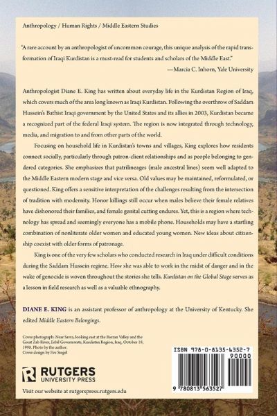Diane E. King has written about everyday life in the Kurdistan Region of Iraq, which covers much of the area long known as Iraqi Kurdistan. One of the few scholars who has done research during the Saddam Hussein regime, King offers a sensitive interpretation of the contradiction resulting from the intersection of tradition with modernity, exploring the ways that residents connect socially through patron-client relationships and as people belonging to gendered categories.