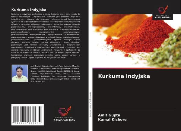 Kurkuma to przyprawa pochodz¿ca z k¿¿czy Curcuma longa, która nale¿y do rodziny imbirowatych (Zingiberaceae). Kurkuma jest podstaw¿ wi¿kszo¿ci indyjskich curry, u¿ywana jako przyprawa i pigment, ¿rodek konserwuj¿cy ¿ywno¿¿ i do celów leczniczych od wieków. Jasno¿ó¿ty kolor kurkumy pochodzi g¿ównie z kurkuminy, g¿ównego kurkuminoidu. Kurkumina wykazuje dziäanie przeciwzapalne, przeciwgor¿czkowe, przeciwbólowe, przeciwutleniaj¿ce, przeciwbakteryjne, przeciwwirusowe, przeciwgrzybicze, przeciwpierwotniakowe, przeciwnowotworowe, neuroprotekcyjne, przeciwdepresyjne, przeciwzakrzepowe, kardioprotekcyjne, hipolipidemiczne, przeciwwrzodowe, przeciwskurczowe, przeciwcukrzycowe, przeciwartretyczne, przeciwmutagenne, przeciwp¿odno¿ciowe i przeciwweneryczne. Wykazuje potencjä przeciw alergiom, zapaleniu stawów, chorobie Alzheimera i innym chorobom przewlek¿ym. Jest równie¿ stosowany wewn¿trznie w dolegliwo¿ciach w¿trobowych i trawiennych, niewydolno¿ci menstruacyjnej i skurczach. Jest szeroko stosowany w ró¿nych ceremoniach religijnych i spo¿ecznych od narodzin do ¿mierci w ró¿nych cz¿¿ciach Indii. Ta ksi¿¿ka b¿dzie stanowi¿ kompendium informacji obejmuj¿ce wszystkie wäne aspekty kurkumy w precyzyjny sposób i b¿dzie przydatna dla wszystkich ludzi nauki.