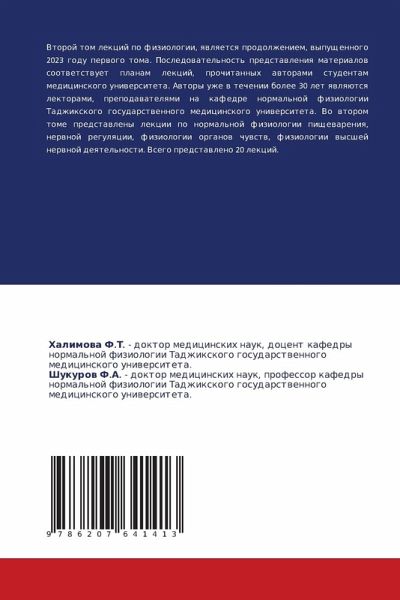Vtoroj tom lekcij po fiziologii, qwlqetsq prodolzheniem, wypuschennogo 2023 godu perwogo toma. Posledowatel'nost' predstawleniq materialow sootwetstwuet planam lekcij, prochitannyh awtorami studentam medicinskogo uniwersiteta. Awtory uzhe w techenii bolee 30 let qwlqütsq lektorami, prepodawatelqmi na kafedre normal'noj fiziologii Tadzhixkogo gosudarstwennogo medicinskogo uniwersiteta. Vo wtorom tome predstawleny lekcii po normal'noj fiziologii pischewareniq, nerwnoj regulqcii, fiziologii organow chuwstw, fiziologii wysshej nerwnoj deqtel'nosti. Vsego predstawleno 20 lekcij.