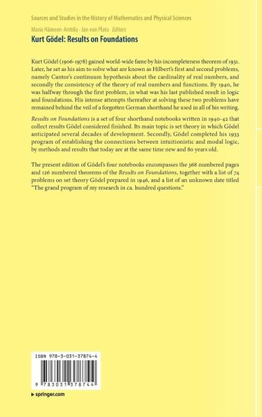 "This book presents an English translation of four notebooks written by Kurt Gödel in regular shorthand, notable for their minimal number of cancellations or small additions between the lines. These notebooks, titled Resultate Grundlagen . The Resultate Grundlagen is an outstanding book that offers a glimpse into the inner workings of Gödel's mathematical genius, revealing the true craft behind his profound insights." (Andrew Schumann, Mathematical Reviews, February, 2025)