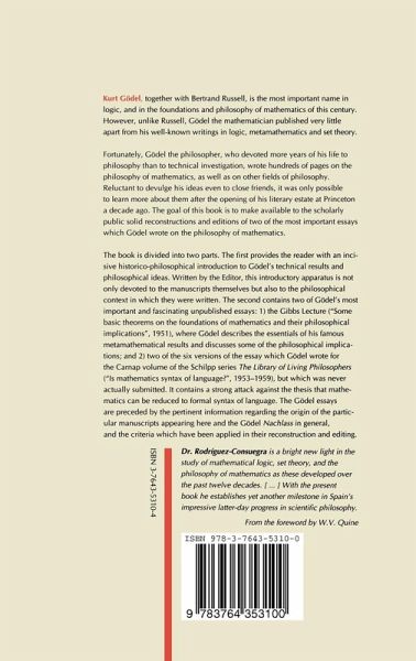 Kurt Gödel, together with Bertrand Russell, is the most important name in logic, and in the foundations and philosophy of mathematics of this century. However, unlike Russel, Gödel the mathematician published very little apart from his well-known writings in logic, metamathematics and set theory. Fortunately, Gödel the philosopher, who devoted more years of his life to philosophy than to technical investigation, wrote hundreds of pages on the philosophy of mathematics, as well as on other fields of philosophy. It was only possible to learn more about his philosophical works after the opening of his literary estate at Princeton a decade ago. The goal of this book is to make available to the scholarly public solid reconstructions and editions of two of the most important essays which Gödel wrote on the philosophy of mathematics. The book is divided into two parts. The first provides the reader with an incisive historico-philosophical introduction to Gödel's technical results and philosophical ideas. Written by the Editor, this introductory apparatus is not only devoted to the manuscripts themselves but also to the philosophical context in which they were written. The second contains two of Gödel's most important and fascinating unpublished essays: 1) the Gibbs Lecture ("Some basic theorems on the foundations of mathematics and their philosophical implications", 1951); and 2) two of the six versions of the essay which Gödel wrote for the Carnap volume of the Schilpp series The Library of Living Philosophers ("Is mathematics syntax of language?", 1953-1959).