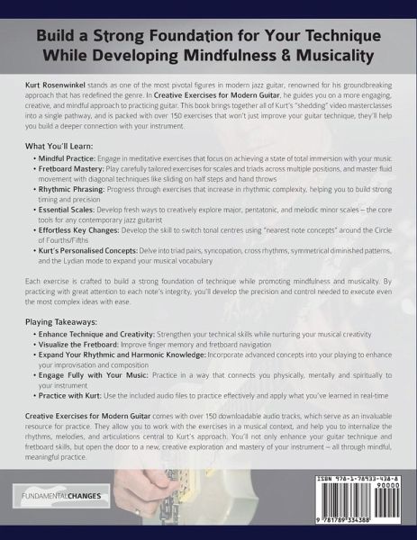 Ready for a more mindful, creative way to develop your technical guitar skills and creativity? Kurt Rosenwinkel stands as one of the most pivotal figures in modern jazz guitar, renowned for his groundbreaking approach that has redefined the genre. His influence extends far beyond his virtuosic playing: his innovative take on composition, harmony, and improvisation has left a lasting imprint on the jazz world, and continues to push the boundaries of what jazz guitar can be. In Creative Exercises for Modern Guitar, Rosenwinkel guides you on a more engaging, creative, and mindful approach to practicing guitar. It brings together all of Kurt's "shedding" video courses into a single pathway, and is packed with over 150 exercises that won't just improve your guitar technique, they'll help you build a deeper connection with your instrument. What You'll Learn: Mindful Practice: Engage in meditative exercises that focus on achieving a state of total immersion with your music. Fretboard Mastery: Play carefully tailored exercises for scales and triads across multiple positions, and master fluid movement with diagonal techniques like sliding on half steps and hand throws. Rhythmic Phrasing: Progress through exercises that increase in rhythmic complexity, helping you to build strong timing and precision. Essential Scales: Develop fresh ways to creatively explore major, pentatonic, and melodic minor scales - the core tools for any contemporary jazz guitarist. Effortless Key Changes: Develop the skill to switch tonal centres using "nearest note concepts" around the Circle of Fourths/Fifths. Kurt's Personalised Concepts: Delve into triad pairs, syncopation, cross rhythms, symmetrical diminished patterns, and the Lydian mode to expand your musical vocabulary. Each exercise is crafted to build a strong foundation of technique while also promoting mindfulness and musicality. By practicing with great attention to each note's integrity, you'll develop the precision and control needed to execute even the most complex ideas with ease. Playing Takeaways: Enhance Technique and Creativity: Strengthen your technical skills while nurturing your musical creativity Visualize the Fretboard: Improve finger memory and fretboard navigation Expand Your Rhythmic and Harmonic Knowledge: Incorporate advanced concepts into your playing to enhance your improvisation and composition Engage Fully with Your Music: Practice in a way that connects you physically, mentally and spiritually to your instrument Practice with Kurt: Use the included audio files to practice effectively and apply what you've learned in real-time. Creative Exercises for Modern Guitar is carefully structured to masterfully build your technical abilities, while emphasizing musicality and relaxation during practice. Audio Exercises for Enhanced Learning Creative Exercises for Modern Guitar comes with over 100 downloadable audio tracks, which serve as an invaluable resource for your practice. They allow you to work with the exercises in a truly musical context, and help you to internalize the rhythms, melodies, and articulations central to Rosenwinkel's approach. In Creative Exercises for Modern Guitar Kurt Rosenwinkel will not only enhance your guitar technique and fretboard skills, he'll open the door to a new, creative exploration and mastery of your instrument - all through mindful, meaningful practice. Buy it now!