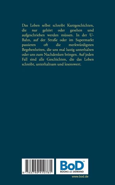 Das Leben selbst schreibt Kurzgeschichten, die nur gehört oder gesehen und aufgeschrieben werden müssen. In der U-Bahn, auf der Straße oder im Supermarkt passieren oft die merkwürdigsten Begebenheiten, die uns mal lustig unterhalten oder uns zum Nachdenken bringen. Auf jeden Fall sind alle Geschichten, die das Leben schreibt, unterhaltsam und lesenswert.