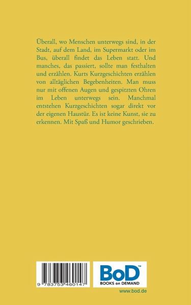 Überall, wo Menschen unterwegs sind, in der Stadt, auf dem Land, im Supermarkt oder im Bus, überall findet das Leben statt. Und manches, das passiert, sollte man festhalten und erzählen. Kurts Kurzgeschichten erzählen von alltäglichen Begebenheiten. Man muss nur mit offenen Augen und gespitzten Ohren im Leben unterwegs sein. Manchmal entstehen Kurzgeschichten sogar direkt vor der eigenen Haustür. Es ist keine Kunst, sie zu erkennen. Mit Spaß und Humor geschrieben.