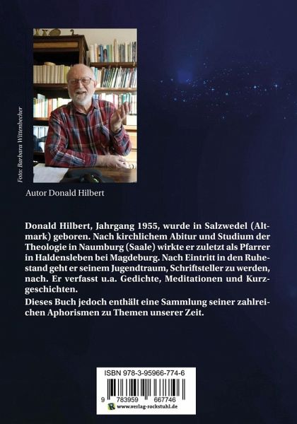Autor: Donald Hilbert. Taschenbuch, 80 SeitenINHALTSVERZEICHNISLOSLASSEN 7DIE TÖRICHTEN 8ETWAS VON HANS 9WUNDER 10ZU VIEL LICHT 11MENSCHHEITSTRAUM 12ZUSAMMENKÜNFTE 13DENKEN 14VON DEN ZIELEN 15GENAU DAZWISCHEN 16KUSCHELDECKE 17VERSTEHEN 18GÄNSEHAUT 19SPENDE 20ARMUT... 21PROPHETEN 22VAGES SEHNEN 23GEDANKENHAUS 24ZEIT GENOMMEN 25NEUER TAG 26LEERE WORTE 27LEBEN 28GENUG 29LIEBE ANS BETT 30UMARMUNG 31SCHMUDDELKIND 32AKTIONISTEN 33SCHATTEN HINTER MIR 34AUS DEM GETÜMMEL 35DAS BÖSE 36ENTSTELLT 37TANZ IN DEN MORGEN 38EIN LIED ... 39IN NÄCHTEN 40WOLKENMACHERLAND 41DER HIMMEL 42AUGEN AM HIMMEL 43LETZTES ADE 44EIN WEISER LEHRTE ... 45VON HOFFNUNG I 46VON HOFFNUNG II 47ZERSTREUUNG 48IN DEN HIMMEL GETRÄUMT 49WEITER BLICK 50TRÄUME ZU HABEN ... 51HIMMEL 52WAS IST WAHR? 53SÜDEUROPA 54LEBENSBACH 55GUTER FREUND 56EIN WEISER ... 57INSCHRIFT: 58NÄCHSTENLIEBE 59EIN ALTER ... 60TALENT 61SPUR 62DAS PORTRÄT 63WIE EIN BRUMMKREISEL 64GESICHT 65STEINEWERFER 66VOM GEBET 67ANKOMMENDE 68EIN LEUCHTTURM 69ÜBER DEN SEGEN 70ERINNERTE WEGE 71WAS BLEIBT 72SMARTPHONE 73VERÄNDERUNG 74STAUNEN 75SCHLEIER 76BOOT 77HOHER SCHNEE 78