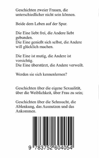 Geschichten zweier Frauen, die unterschiedlicher nicht sein können. Beide dem Leben auf der Spur. Die Eine liebt frei, die Andere liebt gebunden. Die Eine genießt sich selbst, die Andere will glücklich machen. Die Eine ist mutig, die Andere ist vorsichtig. Die Eine überstürzt, die Andere verweilt. Werden sie sich kennenlernen? Geschichten über die eigene Sexualität, über die Weiblichkeit, über Frau zu sein; Geschichten über die Sehnsucht, die Ablenkung, das Ausnutzen und das Ankommen.