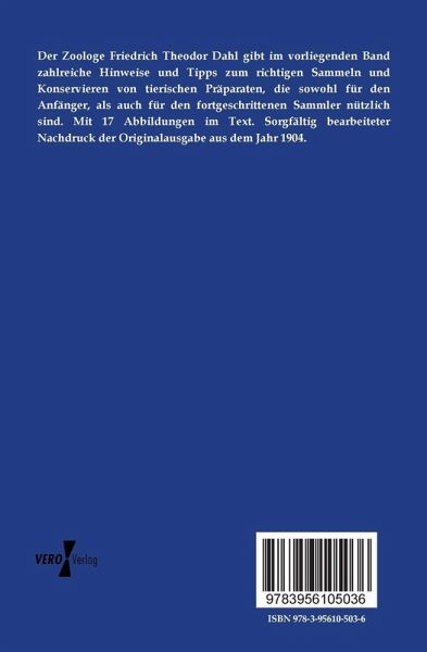 Der Zoologe Friedrich Theodor Dahl gibt im vorliegenden Band zahlreiche Hinweise und Tipps zum richtigen Sammeln und Konservieren von tierischen Präparaten, die sowohl für den Anfänger, als auch für den fortgeschrittenen Sammler nützlich sind. Mit 17 Abbildungen im Text. Sorgfältig bearbeiteter Nachdruck der Originalausgabe aus dem Jahr 1904.