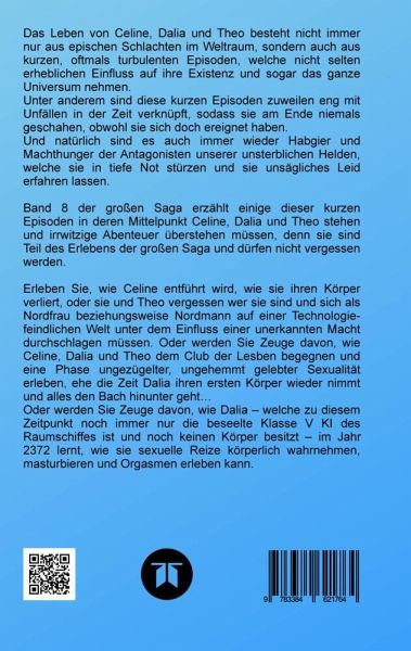 Das Leben von Celine, Dalia und Theo besteht nicht immer nur aus epischen Schlachten im Weltraum, sondern auch aus kurzen, oftmals turbulenten Episoden, welche nicht selten erheblichen Einfluss auf ihre Existenz und sogar das ganze Universum nehmen.Unter anderem sind diese kurzen Episoden zuweilen eng mit Unfällen in der Zeit verknüpft, sodass sie am Ende niemals geschahen, obwohl sie sich doch ereignet haben. Und natürlich sind es auch immer wieder Habgier und Machthunger der Antagonisten unserer unsterblichen Helden, welche sie in tiefe Not stürzen und sie unsägliches Leid erfahren lassen.Band 8 der großen Saga erzählt einige dieser kurzen Episoden in deren Mittelpunkt Celine, Dalia und Theo stehen und irrwitzige Abenteuer überstehen müssen, denn sie sind Teil des Erlebens der großen Saga und dürfen nicht vergessen werden.Erleben Sie, wie Celine entführt wird, wie sie ihren Körper verliert, oder sie und Theo vergessen wer sie sind und sich als Nordfrau beziehungsweise Nordmann auf einer Technologie-feindlichen Welt unter dem Einfluss einer unerkannten Macht durchschlagen müssen. Oder werden Sie Zeuge davon, wie Celine, Dalia und Theo dem Club der Lesben begegnen und eine Phase ungezügelter, ungehemmt gelebter Sexualität erleben, ehe die Zeit Dalia ihren ersten Körper wieder nimmt und alles den Bach hinunter geht...Oder werden Sie Zeuge davon, wie Dalia - welche zu diesem Zeitpunkt noch immer nur die beseelte Klasse V KI des Raumschiffes ist und noch keinen Körper besitzt - im Jahr 2372 lernt, wie sie sexuelle Reize körperlich wahrnehmen, masturbieren und Orgasmen erleben kann.
