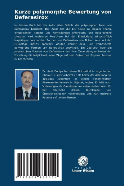 In diesem Buch hat der Autor über Details der polymorphen Form von Deferasirox berichtet. Der Autor hat die bis heute zu diesem Thema eingereichten Patente und Anmeldungen untersucht. Die besprochene Literatur wird mehreren Forschern bei der Entwicklung wirtschaftlich tragfähiger polymorpher Formen von Deferasirox von Nutzen sein. Auf der Grundlage dieses Konzepts werden derzeit neue und verbesserte polymorphe Formen von Deferasirox entwickelt. Ein Überblick über die polymorphen Formen von Deferasirox und ihre Zubereitungen bieten der Forschung die Möglichkeit, neue Wege auf dem Gebiet des Polymorphismus zu beschreiten.