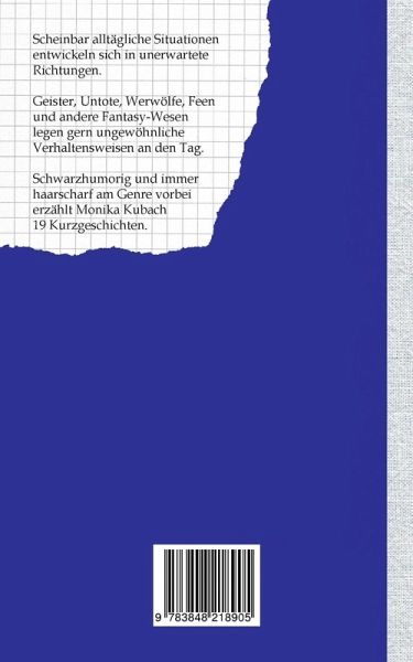 Scheinbar alltägliche Situationen entwickeln sich in unerwartete Richtungen. Geister, Untote, Werwölfe, Feen und andere Fantasy-Wesen legen gern ungewöhnliche Verhaltensweisen an den Tag. Schwarzhumorig und immer haarscharf am Genre vorbei erzählt Monika Kubach 19 Kurzgeschichten.