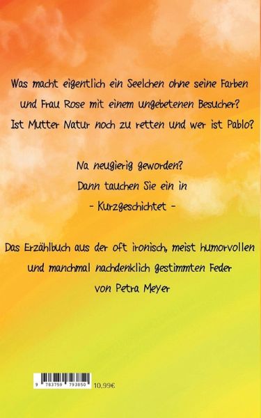 Was macht eigentlich ein Selchen ohne seine Farben und Frau Rose mit einem ungebetenen Besucher? Ist Mutter Natur noch zu retten und wer ist Pablo? Na neugierig geworden? Dann tauchen sie ein in -Kurzgeschichtet- Das Erzählbuch aus der oft ironisch, meist humorvoll und manchmal nachdenklich gestimmten Feder von Petra Meyer.
