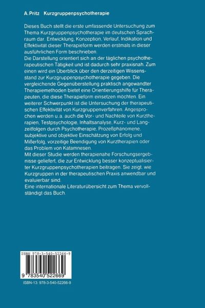 1 Einführung in den Problemkreis der Kurzgruppenpsychotherapie.- 1.1 Prävalenz psychischer Störungen und steigendes Bedürfnis nach Psychotherapie.- 1.2 Finanzierungsproblematik von Psychotherapie.- 1.3 Grundlagen der Kurzpsychotherapie.- 1.4 Grundlagen der Gruppenpsychotherapie.- 1.5 Gegenwärtiger Stand der Kurzgruppenpsychotherapie.- 2 Angewandte kurzgruppenpsychotherapeutische Verfahren.- 2.1 Autogenes Training nach J.H. Schultz.- 2.2 Progressive Muskelentspannung nach Jacobson.- 2.3 Analytische Kurzgruppenpsychotherapie.- 2.4 Gegenüberstellung der 3 Behandlungsmethoden (AT-PME-AKG).- 3 Methodische Grundlagen der Untersuchung.- 3.1 Psychotherapieforschung als Anwendungsforschung.- 3.2 Vortest-Nachtest-Kontrollgruppendesign.- 3.3 Testbatterie als Evaluierungsinstrument.- 3.4 Prozeßforschung.- 3.5 Inhaltsanalyse.- 3.6 Kontrollgruppen in der Psychotherapieforschung.- 3.7 Bedeutung der "inneren"Reagibilität im Vorfeld einer psychotherapeutischen Behandlung.- 3.8 Statistische Auswertung.- 3.9 Unterschiede zwischen idealen Bedingungen des Laborexperiments und der Realität der Psychotherapieforschung.- 4 Aufbau und Durchführung der Untersuchung.- 4.1 Ort.- 4.2 Experimentelles Design und Datenerhebung.- 4.3 Anzahl der untersuchten Personen und Therapiegruppenzugehörigkeit.- 4.4 Meßinstrumente.- 4.5 Psychotherapeuten.- 4.6 Ablauf der kurzgruppenpsychotherapeutischen Behandlungen.- 5 Beschreibung der untersuchten Patienten.- 5.1 Beschreibung der Patientenstichprobe nach verschiedenen Kontrollmerkmalen.- 5.2 Beschreibung der Teilnehmerstichprobe auf den Kriteriumvariablen der psychologischen Tests.- 5.3 Diagnostische Einschätzung der Patientenstichprobe aufgrund der Testergebnisse.- 6 Testpsychologische Vergleichsuntersuchungen derKurzgruppenpsychotherapiemethoden.- 6.1 Veränderung der gesamten Therapiegruppe (AT+PME+AKG).- im Vergleich zur Kontrollgruppe.- 6.2 Therapieeffekte des AT.- 6.3 Therapieeffekte der PME.- 6.4 Therapieeffekte der AKG.- 7 Testpsychologische Untersuchungen zur Indikationsstellung in den Kurzgruppentherapien.- 7.1 Problemstellung.- 7.2 Bildung der unterschiedlichen Symptomkomplexe.- 7.3 Therapiegruppenvergleiche.- 8 Determinanten des Therapieerfolgs (Pfadanalyse).- 8.1 Problemstellung.- 8.2 Planung und Durchführung.- 8.3 Ergebnisse.- 9 Verlaufsmessungen und subjektive Beurteilungen des Therapieerfolgs.- 9.1 Gruppenbefindlichkeitssoziogramm.- 9.2 Therapeutenbeurteilung.- 9.3 Medikamentengebrauch.- 9.4 Übungsverhalten.- 9.5 Beurteilung des Therapieerfolgs.- durch die Patienten.- 10 Vorzeitige Beendigung der Therapie (Therapieabbruch).- 10.1 Problemstellung.- 10.2 Gründe für die vorzeitige Beendigung einer Gruppentherapie.- 10.3 Beschreibung der untersuchten Stichprobe.- 10.4 Darstellung der Testergebnisse.- 10.5 Durchführung der inhaltsanalytischen Untersuchung.- 10.6 Zusammenfassung der testdiagnostischen und inhaltsanalytischen Untersuchung.- 11 Inhaltsanalytische Evaluierung des Therapeutenverhaltens.- 11.1 Problemstellung.- 11.2 Inhaltsanalytische Auswertung.- der Tonbandprotokolle.- 11.3 Evaluierung des Therapeutenverhaltens in den unterschiedlichen Therapiegruppen (AT, PME, AKG) nach den Kategorien von Temple, Lennard u. Bernstein und Truax u. Carkuff.- 11.4 Diskussion.- 12 Nachuntersuchung.- 12.1 Problemstellung.- 12.2 Durchführung.- 12.3 Ergebnisse.- 12.4 Zusammenfassung.- 13 Zusammenfassung und Diskussion.- 13.1 Patientenstichprobe.- 13.2 Effekte der Kurzgruppentherapie.- 13.3 Effekte in der Kontrollgruppe.- 13.4 Unterschiedliche Effekte der 3Behandlungsmethoden.- 13.5 Determinanten des Therapieerfolgs.- 13.6 Indikationsstellung.- 13.7 Verlaufsmessungen.- 13.8 Vorzeitige Beendigung der Therapie.- 13.9 Therapeutenverhalten.- 13.10 Nachuntersuchung.- 13.11 Probleme bei der Untersuchungsdurchführung.- 13.12 Weitere Forschungsperspektiven.- Literatur.