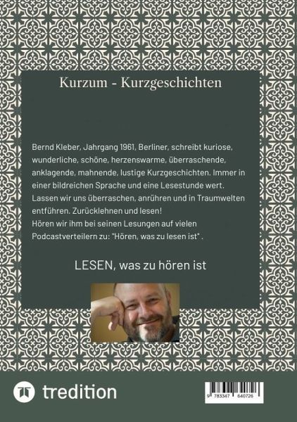 Bernd Kleber wurde 1961 in Berlin geboren, ist bekennender Berliner und lebt und arbeitet hier als Kaufmann. Er schreibt beeindruckende Erzählungen, die nach mehr verlangen. Die Philologin Clara Sinn warnt augenzwinkernd vor diesem Suchtpotential. Wir lachen, schmunzeln, sind gerührt bei seinen Stoffen, die in uns nachhallen. Immer sind es emotional verpackte Geschichten, die nicht so schnell aus dem Kopf gehen. In seinen Storys hält er uns oft einen Spiegel vor oder lässt Themen des Miteinander, gesellschaftliche Aspekte einfließen. Fesselnde Unterhaltung auf hohem Niveau, sensibel illustriert aus seiner fotografischen Sammlung. Von seinen Geschichten wurden einige prämiert und in Anthologien verschiedener Verlage veröffentlicht. Viele kennen ihn auch inzwischen aus seinem erfolgreichen Podcast: "Höre, was zu lesen ist ...".